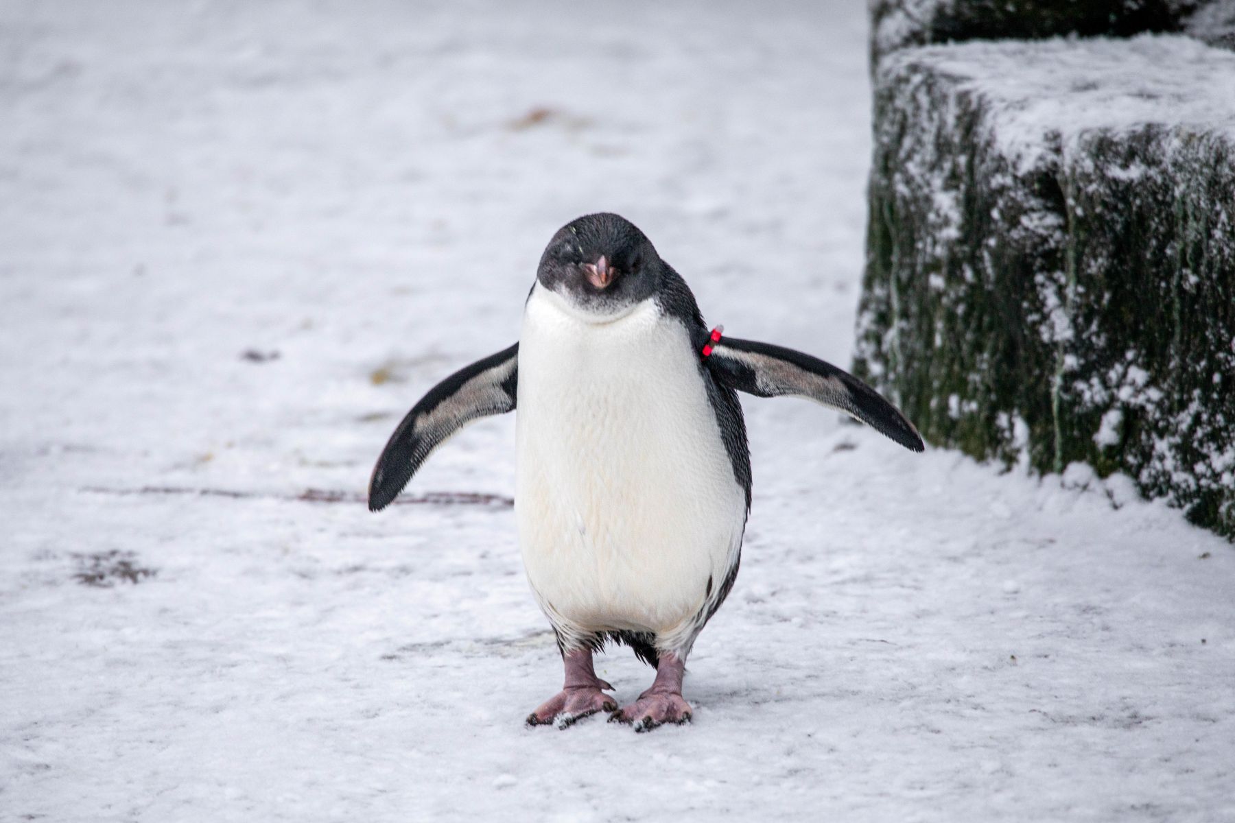 The wildlife conservation charity fitted Poly with a modified recovery suit, which is normally used for cats, to allow fluid to drain while she healed. With the drain removed, she moved back in with the colony at Penguins Rock, just in time for the January snow (and to celebrate Penguin Awareness Day!).